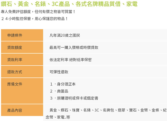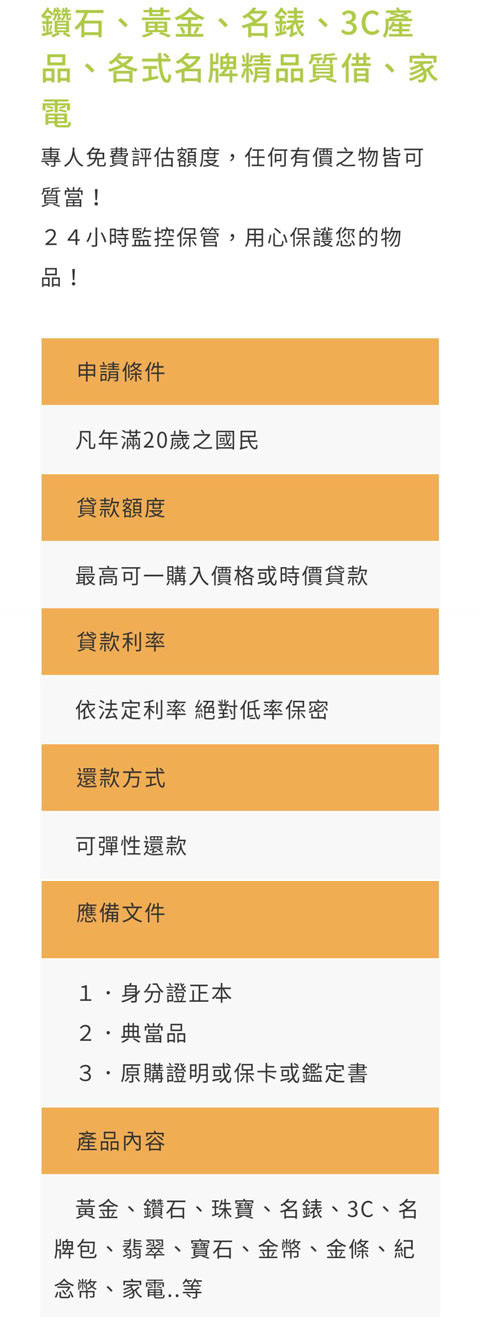 3.各項借款每萬元月利息最高2.5%(以當舖法規定為準)